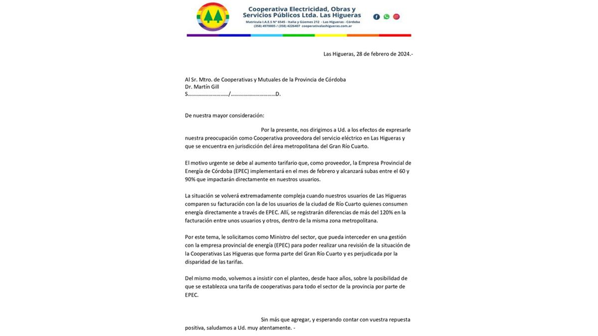 “La situación se volverá extremadamente compleja cuando nuestros usuarios de Las Higueras comparen su facturación con la de los usuarios de la ciudad de Río Cuarto, quienes consumen energía directamente a través de Epec. Allí se registrarán diferencias de más del 120% en la facturación entre unos usuarios y otros, dentro de la misma zona metropolitana”, expresaron desde la entidad en la nota que fue entregada al funcionario provincial.