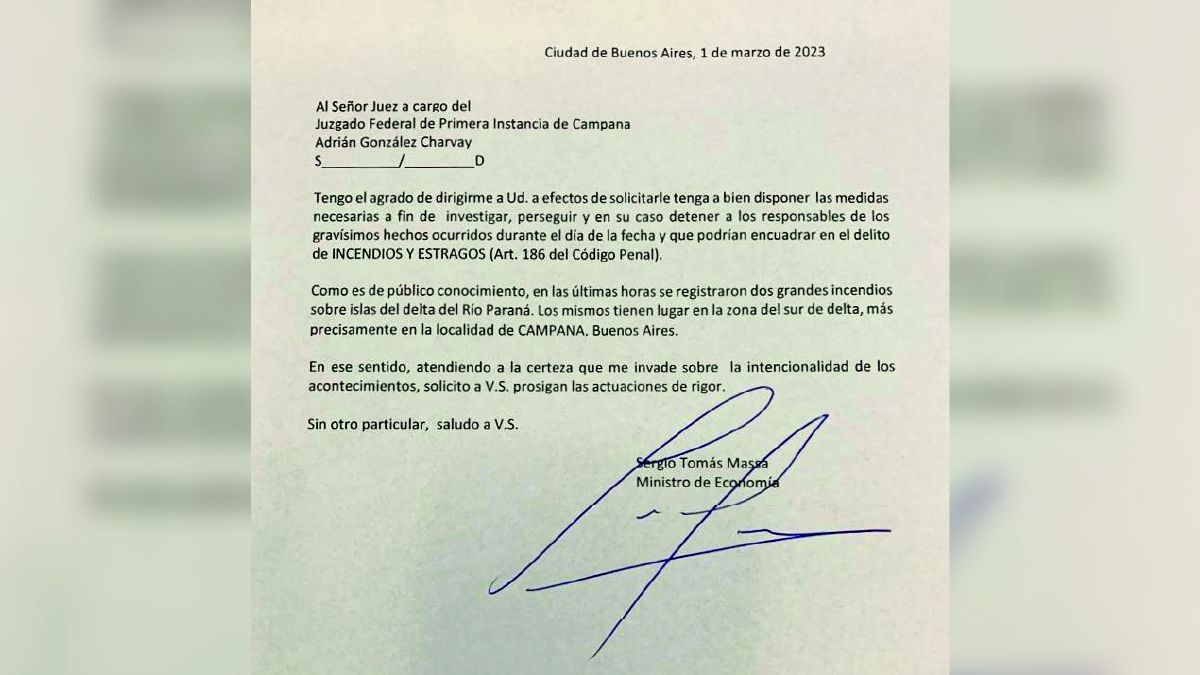 El ministro de Economía, Sergio Massa, presentó hoy una denuncia ante la justicia federal "a fin de investigar, perseguir y en su caso detener" a los responsables de los incendios que afectaron a redes de alta tensión en el partido bonaerense de Campana, episodios sobre los que expresó sus sospechas de "intencionalidad" y que determinaron el corte preventivo del servicio eléctrico en gran parte del país.