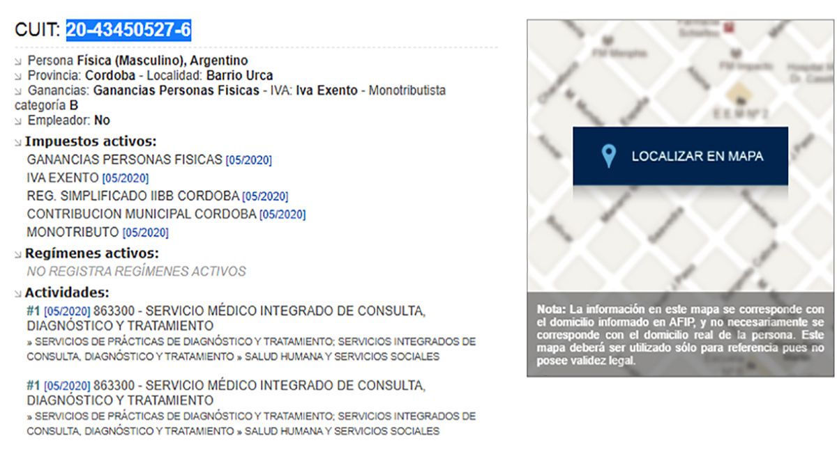El joven, con residencia en barrio Urca, de Córdoba, también pensaba incursionar en el sector privado de la salud. Según consta en el organismo fiscal, el médico trucho se inscribió en mayo del año pasado en la actividad “Servicio médico integrado de consulta, diagnóstico y tratamiento”. En la categoría figura como monotributista categoría B y tributa Ingresos Brutos a la Provincia y la Contribución Municipal a Córdoba.