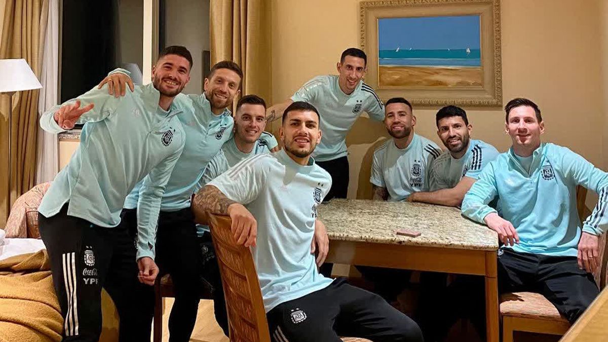 En la primera foto se lo ve junto a Leandro Paredes, Rodrigo de Paul, Alejandro Gómez, Giovani Lo Celso, Ángel Di María, Nicolás Otamendi y Sergio Agüero con las cartas sobre la mesa, mientras que en la segunda Messi, De Paul, y Paredes sonríen con sus respectivos trofeos.