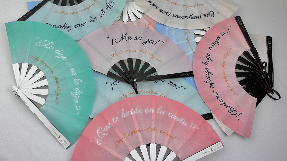 Ramiro tiene la costumbre de elegir un souvenir para cada cumpleaños de Mirtha. El año pasado habían sido fotos de Mirtha a lo largo de su carrera con el nombre de cada invitado. Y ahora se le había ocurrido el tema de los abanicos. La verdad es que tuvo mucha repercusión. La cuestión es que le hablé, le dije que no se hiciera problemas, que se lo hacíamos de cualquier manera y se lo mandábamos lo más rápido posible.