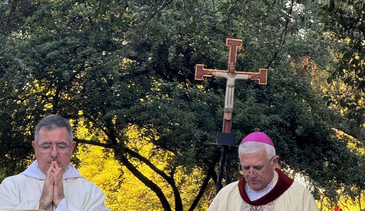 El obispo de Río Cuarto, Adolfo Uriona, presidió ayer la Misa de la Navidad en el Eremitorio Nuestra Señora del Signo, junto al padre Gerardo Rivetti.