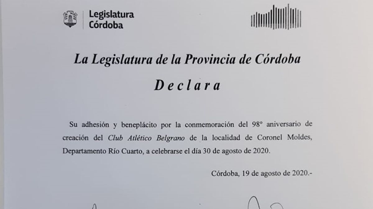 La Legislatura provincial envió su adhesión a la celebración de los 98 años de Belgrano de Coronel Moldes. La entidad estará de festejo el próximo 30 de agosto.