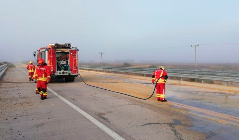 Un camión perdió la carga de expeller de soja que trasladaba esta madrugada por ruta nacional 35 y debido al estado en que quedó la carpeta asfáltica en el trazado afectado se resolvió interrumpir el tránsito a modo preventivo entre Vicuña Mackenna y Holmberg, en un principio, y luego se acotó el tramo al trayecto que va desde el cruce hacia Coronel Moldes hasta Holmberg.