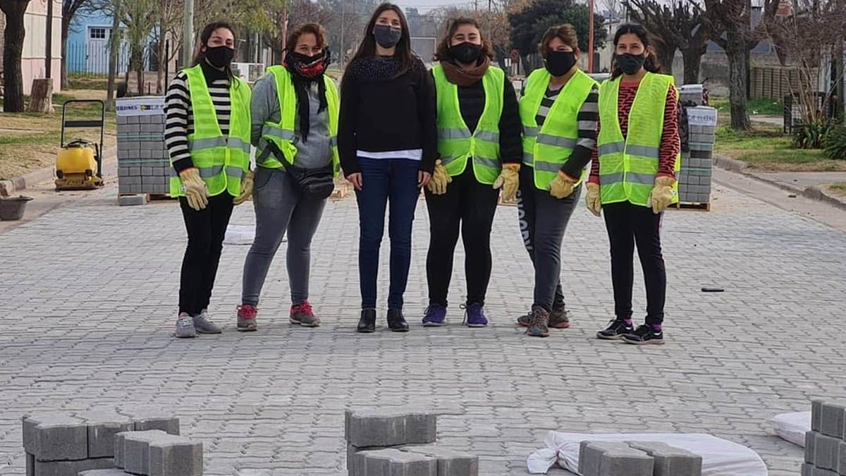 En Las Perdices también hay una experiencia similar y la obra de adoquinado está a cargo de seis mujeres y un hombre.