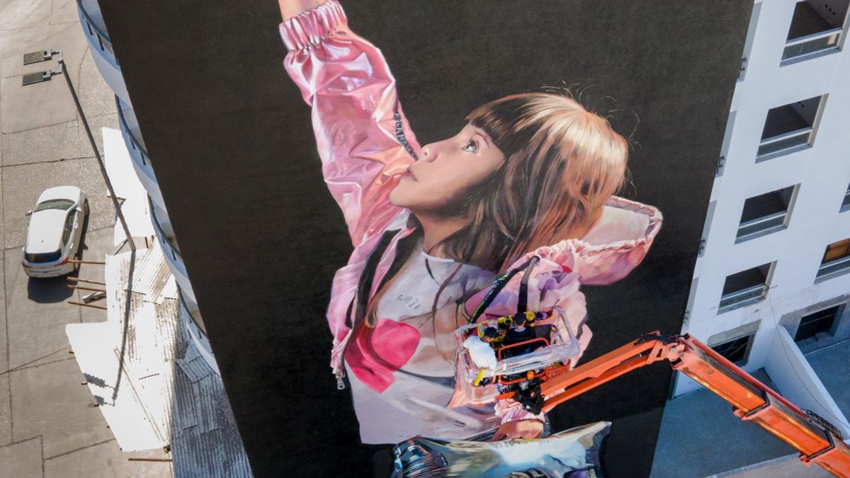 “Olivia mira al cielo” es un impactante mural de 30 metros de alto por 8 de ancho plasmado sobre la medianera de un edificio ubicado sobre avenida Pueyrredón 864 de la ciudad de Córdoba.