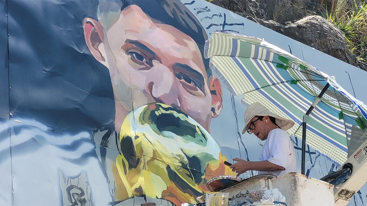 Embalse está de fiesta con su campeón mundialista Nahuel Molina Lucero y, en el marco de uno de los reconocimientos, se lleva a cabo un mural en su honor en la cuesta del Cerro de los Enamorados.