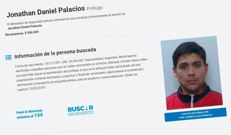 El Ministerio de Seguridad de la Nación difundió en las últimas horas una solicitud de información que "conduzca directamente al arresto del prófugo riocuartense Jonathan Daniel Palacios" con una recompensa de $ 500.000, en el marco de la causa que investiga el lavado de activos generados a partir de la acitividad ilegal del narcotráfico.
