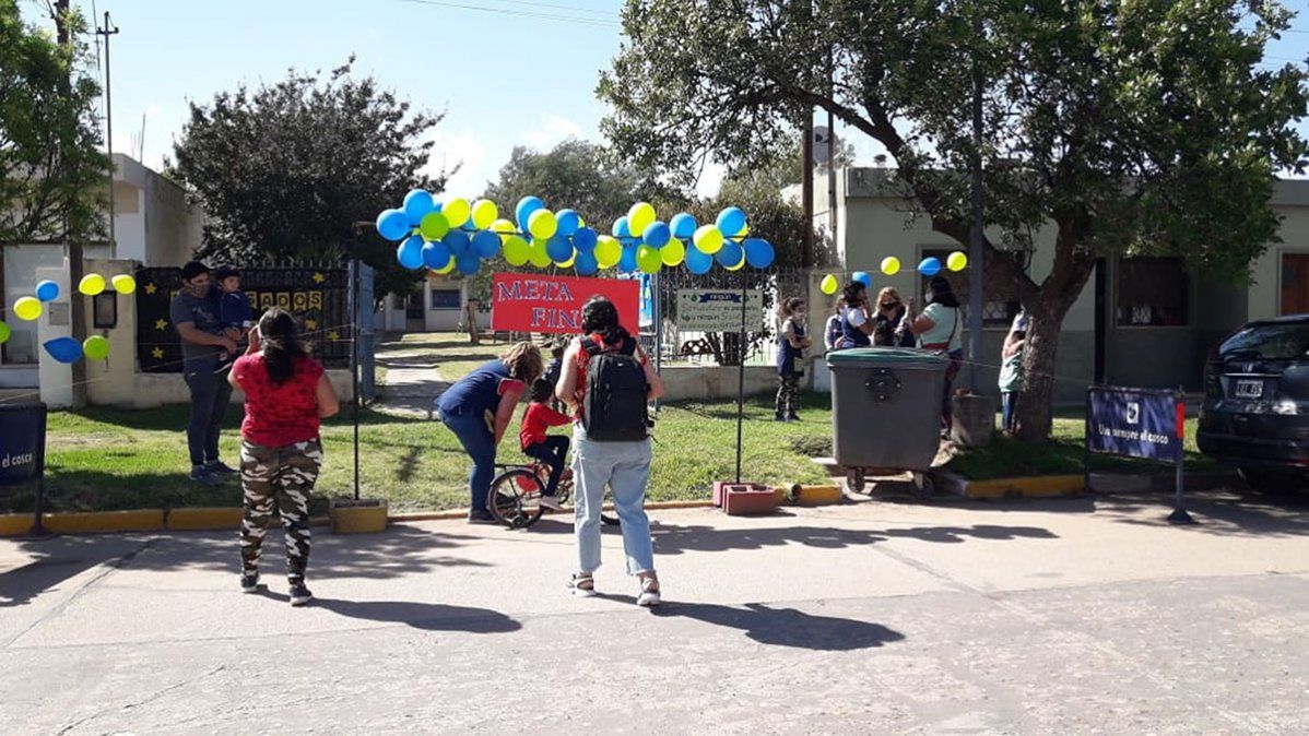 Para marcar la finalización de las actividades virtuales de la sala de 5 años, la directora y el personal docente del Jardín de Infantes José María Paz, ayer compartieron el último paso de los egresados 2020, frente al edificio escolar. Después de que desde marzo, los pequeños no pudieran tener clases presenciales. Estuvieron junto con familiares, amigos y autoridades escolares, respetando los protocolos preventivos. Armaron un arco con globos, del cual colgaba un cartel que decía “Meta final”.