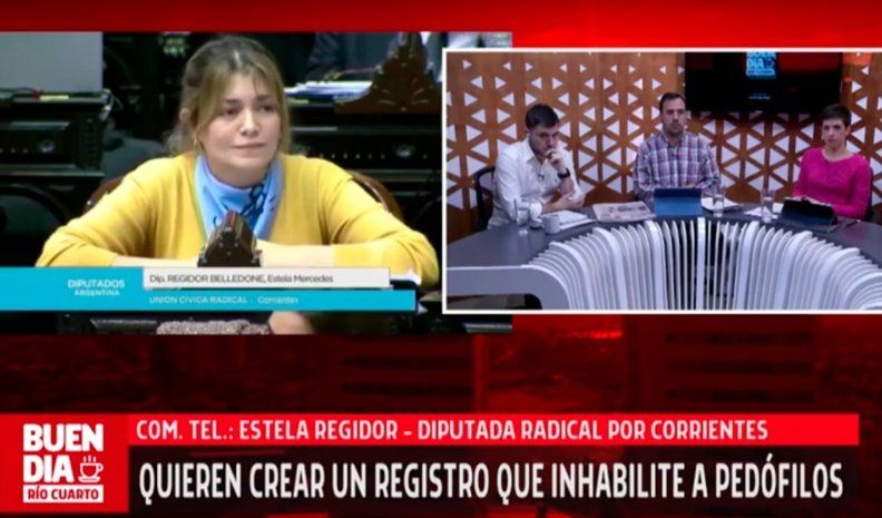Regidor indicó que son dos iniciativas las que esperan su tratamiento en comisiones de la Cámara baja. "El primero es para crear un registro para todas las personas que cometan delitos sexuales contra menores", señaló la diputada en diálogo con Buen Día Río Cuarto, programa que se emite de 8 a 10 por Puntal.com.ar.