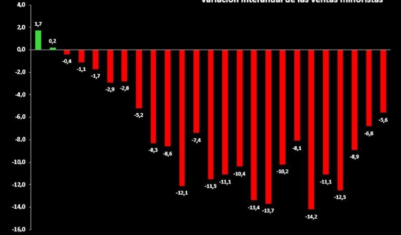 De este modo, con el dato del mes de enero suman veintitrés los meses de caída consecutiva en las ventas minoristas. En diciembre la caída interanual fue del 6,8%.