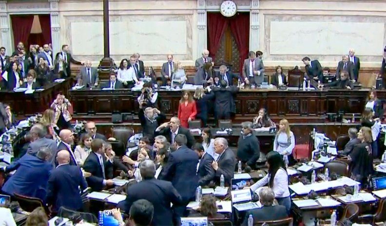 Mientras el presidente de la Cámara de Diputados, Emilio Monzó, pedía orden y lidiaba con los diputados kirchneristas que subieron al estrado para reclamarle que levante la sesión, Massot y Filmus se gritaban, rodeados de legisladores que, mientras los separaban, también intercambiaban gritos e insultos.