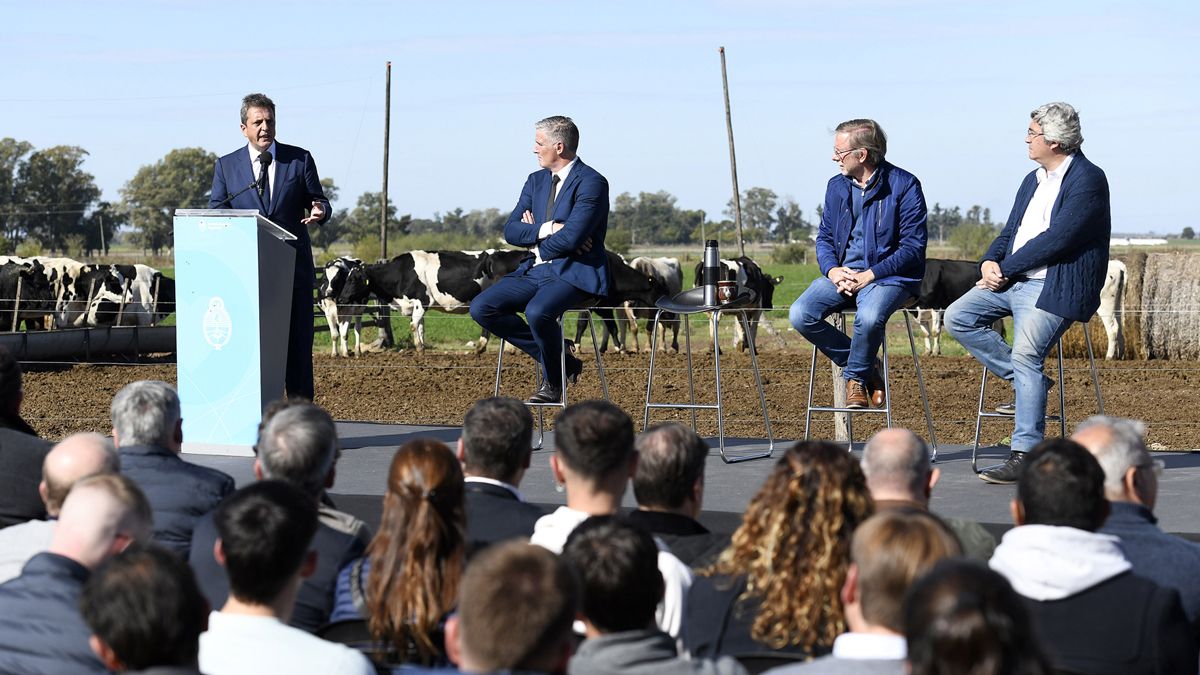 Desde un tambo de Navarro, el ministro compartió los anuncios con el secretario de Agricultura, Ganadería y Pesca, Juan José Bahillo; el ministro de Desarrollo Agrario bonaerense, Javier Rodríguez; y el intendente local, Facundo Diz.