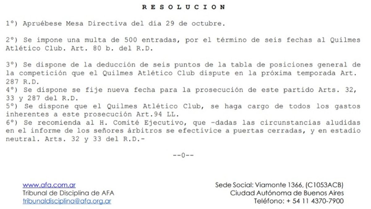 Como dato a destacar se le descontarán seis puntos al club la próxima temporada, ya sea que se encuentre en Primera División o en la Primera Nacional, y sufrirá la pérdida de 500 entradas durante seis fechas consecutivas.