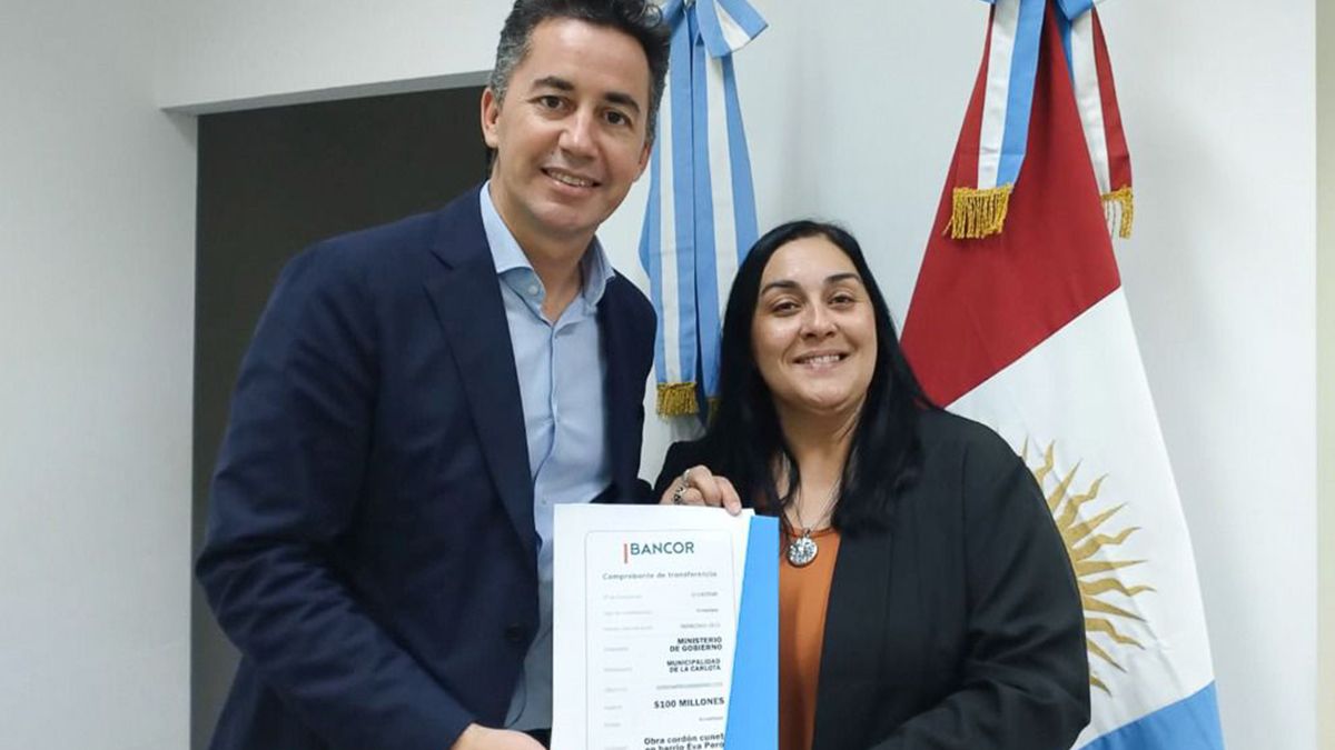 El ministro Manuel Calvo también entregó a la intendenta de La Carlota, Natalia Bellón, fondos por el valor de 100 millones de pesos, destinados a obras de infraestructura básica.