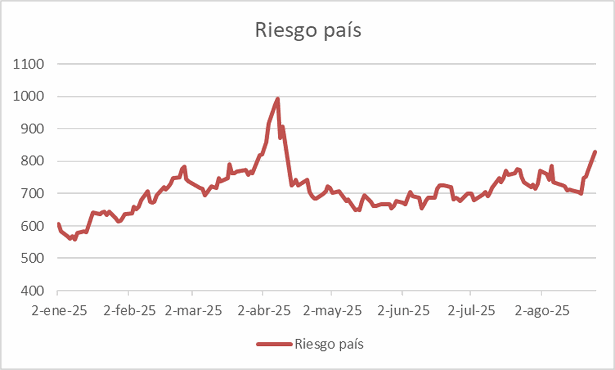 Este es el dato que más preocupa al Gobierno porque necesita que este indicador se desplome a la zona de 300/400 puntos para estar en condiciones de empezar a planear la refinanciación de la deuda que vence en dólares durante 2026.
