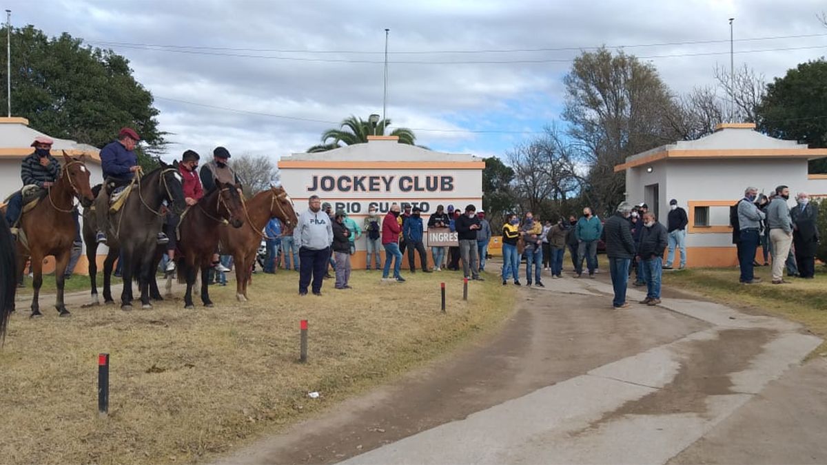 Representantes de la comisión de Turf del Jockey Club de Río Cuarto y trabajadores que dependen directamente de la actividad se concentraron en el ingreso del predio del Hipódromo local para pedir por la reactivación de las carreras en el marco de un banderazo que se realiza a nivel nacional.
