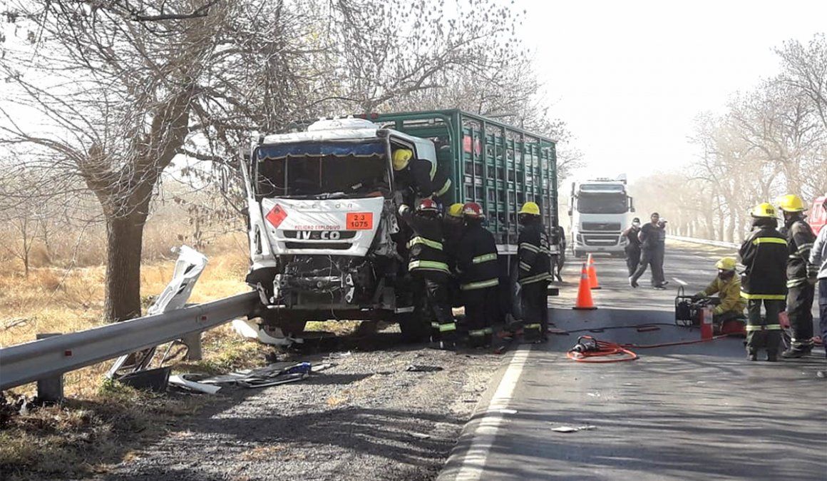 Un camión Iveco, cargado con garrafas, conducido por un joven de 22 años, oriundo de Vicuña Mackenna, colisionó la parte trasera del acoplado de un camión Fiat 619, conducido por un ciudadano de 26 años, con domicilio en la localidad mendocina de Junín, que debió frenar ante el despiste de un automóvil Chevrolet Corsa, que se cruzó de carril.