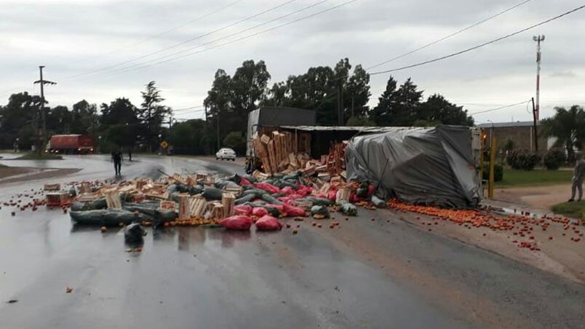 Por causas a establecer, el vehículo de gran porte que traía un acoplado cargado con tomates, el cual era remolcado por un camión Fiat Iveco, volcó y quedó en medio de la ruta con todo el alimento esparcido en la carpeta asfáltica.