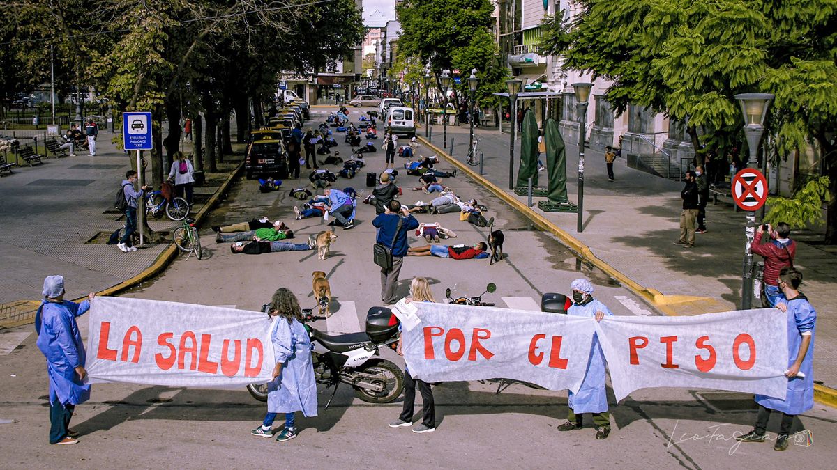 Con una intervención artística en el centro de la ciudad, trabajadores de la salud encabezaron una manifestación en la que llamaron a defender la salud pública y visibilizaron una serie de demandas del sector.