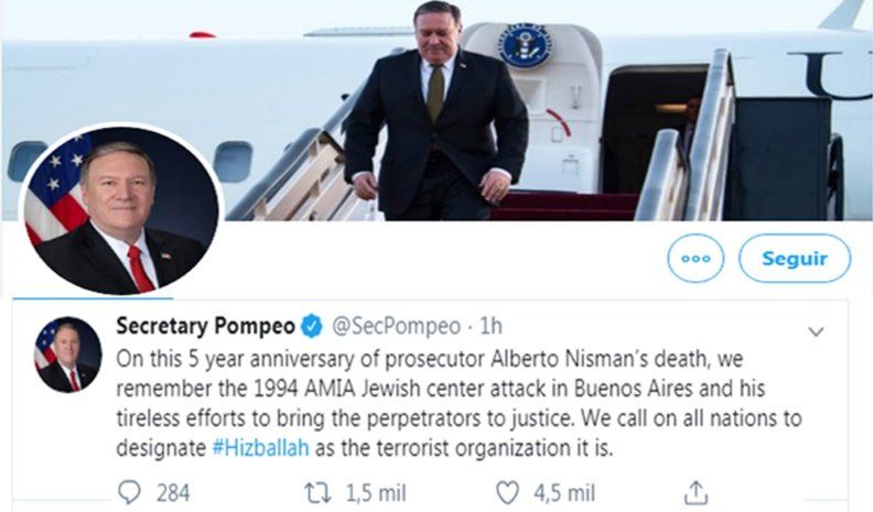 El secretario de Estado de Estados Unidos, Mike Pompeo, recordó al fallecido fiscal Alberto Nisman a cinco años de su muerte y destacó su "esfuerzo incansable" en la causa Amia, al tiempo que instó al mundo a declarar "organización terrorista" a Hezbolá.