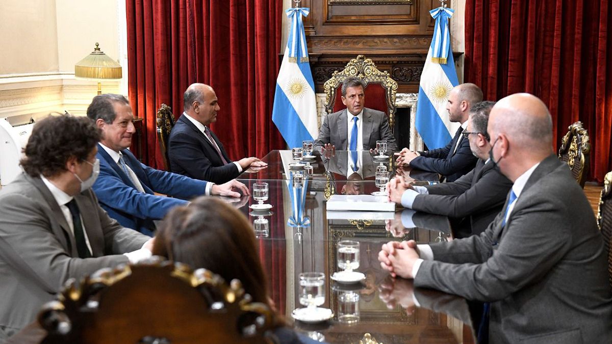 Sergio Massa recibió en el Salón de Honor al jefe de Gabinete de Ministros, Juan Manzur; el ministro de Economía, Martín Guzmán; el secretario de Hacienda, Raúl Rigo; el representante ante el FMI, Sergio Chodos; el presidente del Banco Central, Miguel Ángel Pesce, al ministro de Desarrollo Productivo, Matías Kulfas, y la portavoz presidencial Gabriela Cerruti.