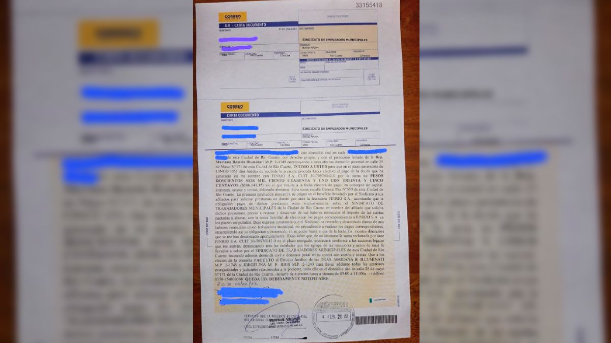En concreto, la financiera le reclamó 206.141 pesos por capital, intereses y costas, bajo apercibimiento de embargo de haberes.