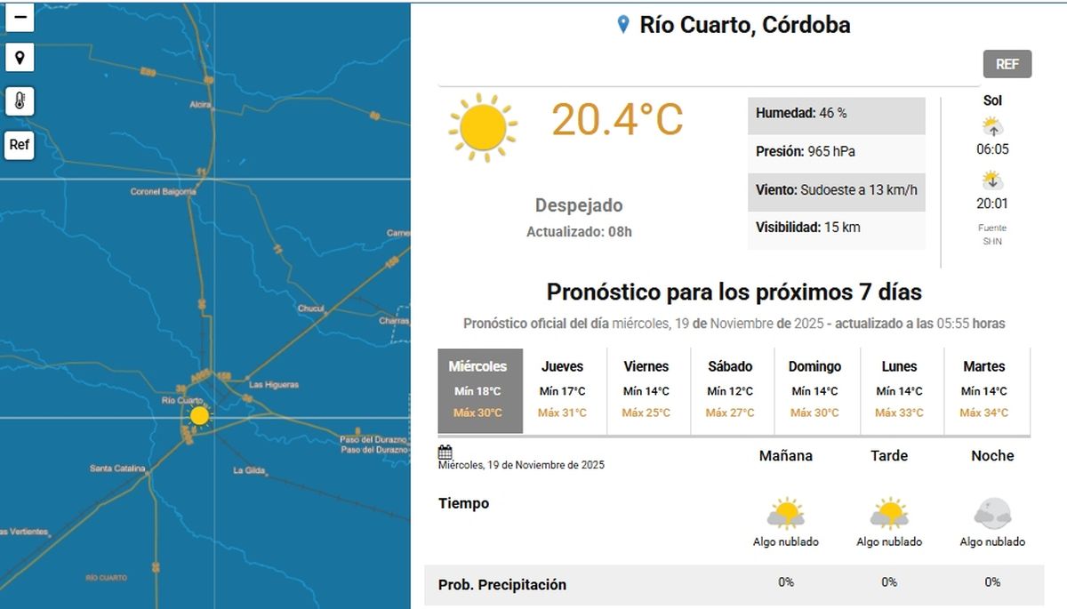Según el Servicio Meteorológico Nacional, el termómetro seguirá indicando máximas superiores a 30° en Río Cuarto y región. Para hoy la mínima estimada es de 18°, cielo algo nublado.