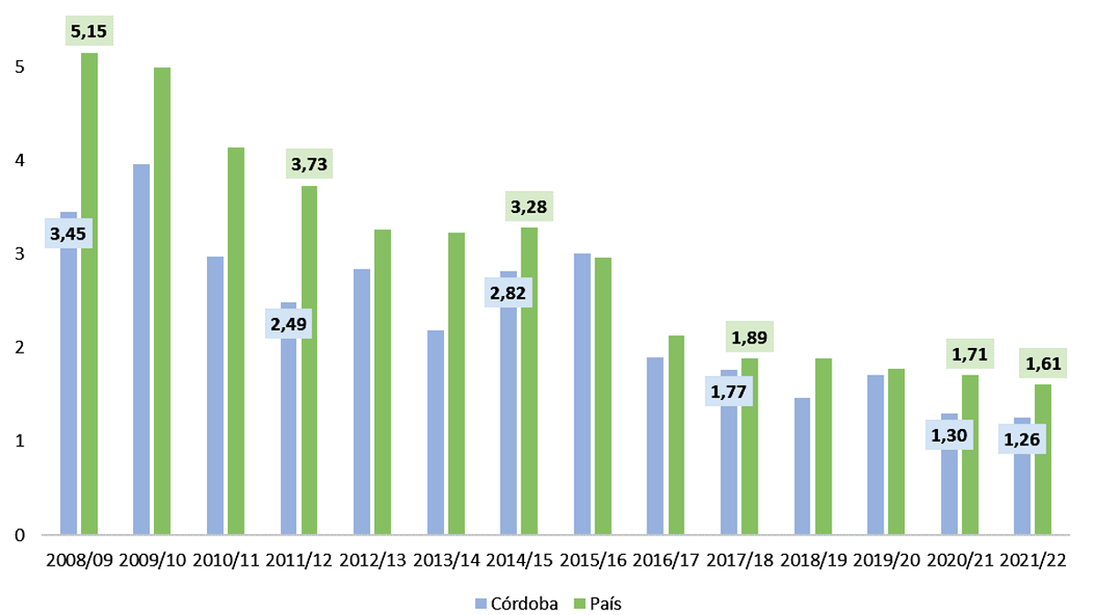 En los últimos años, particularmente a partir de la campaña 2016/17, el área sembrada de maíz creció en detrimento de la de soja, derivando en una mayor producción del cereal a nivel nacional y una caída en la de la oleaginosa. De esta manera, para la campaña 2020/21, por cada hectárea de maíz se sembraron 1,71 de soja, mientras que esta relación fue de 5,15 en 2008/09 y de 3,28 en 2014/15. Los datos surgen del último trabajo realizado por la Bolsa de Cereales de Córdoba.