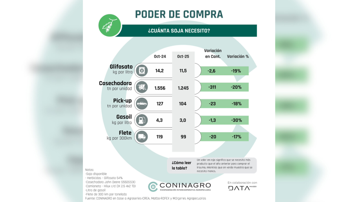 Con la campaña gruesa en marcha, y mientras las sembradoras ganan hectáreas, un nuevo informe de Coninagro sobre el poder de compra de productos agropecuarios demostró que en el caso de la soja su relación con insumos y bienes del agro mejoró. Es decir, se necesitan menos kilos de la oleaginosa para adquirir los mismos productos que un año atrás.