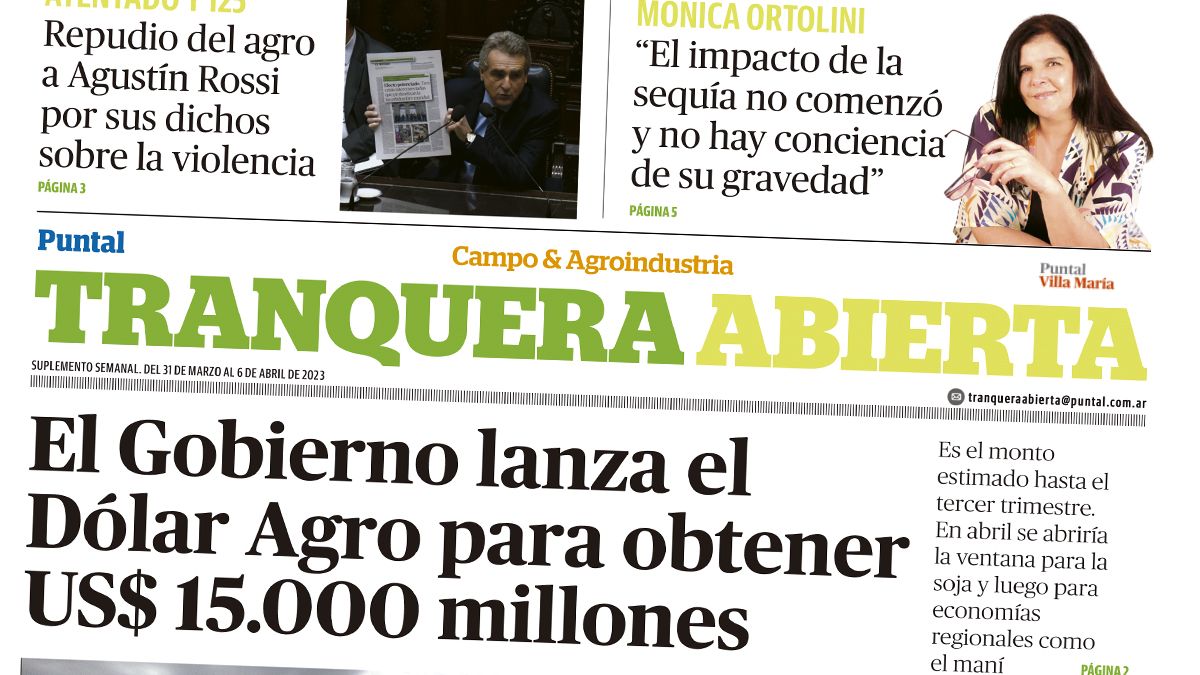 El suplemento Tranquera Abierta publica hoy entre sus principales títulos "El Gobierno lanza el Dólar Agro para obtener US$ 15.000 millones", es el monto estimado hasta el tercer trimestre. En abril se abriría la ventana para la soja y luego para economías regionales como el maní.