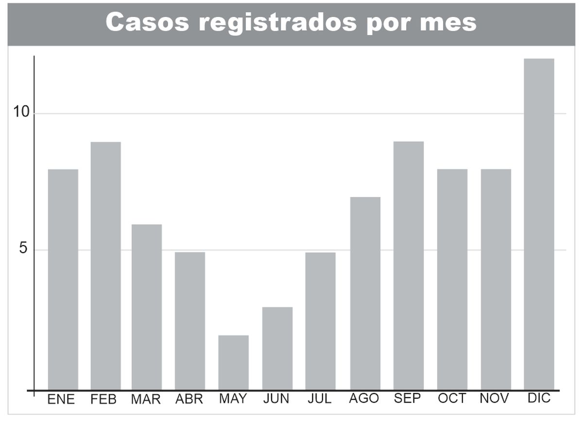 La estadística del año pasado revela también que casi el 80 por ciento de los casos analizados en la morgue correspondieton a hombres y poco más del 20% a mujeres. También muestra los meses de más casos registrados: diciembre encabeza con 12 casos, seguido por febrero y septiembre, con 9 cada uno. Un escalón más abajo aparecen octubre y noviembre con 8. El año pasado, mayo, junio y julio fueron los que tuvieron la menor cantidad de casos: 2, 3 y 5 respectivamente.