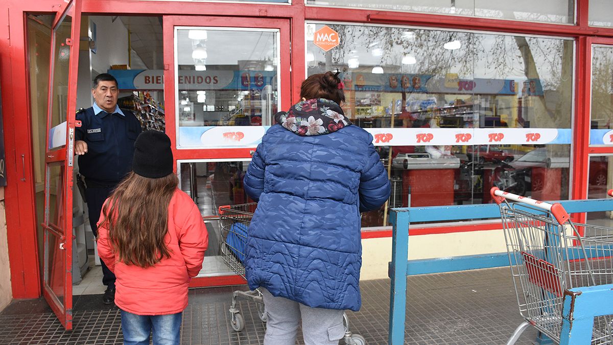 En una recorrida que hizo Puntal, se pudo observar que en los súper locales atendían al público con las persianas de las puertas de ingreso a media altura y un agente de seguridad haciendo allí la vigilancia correspondiente.