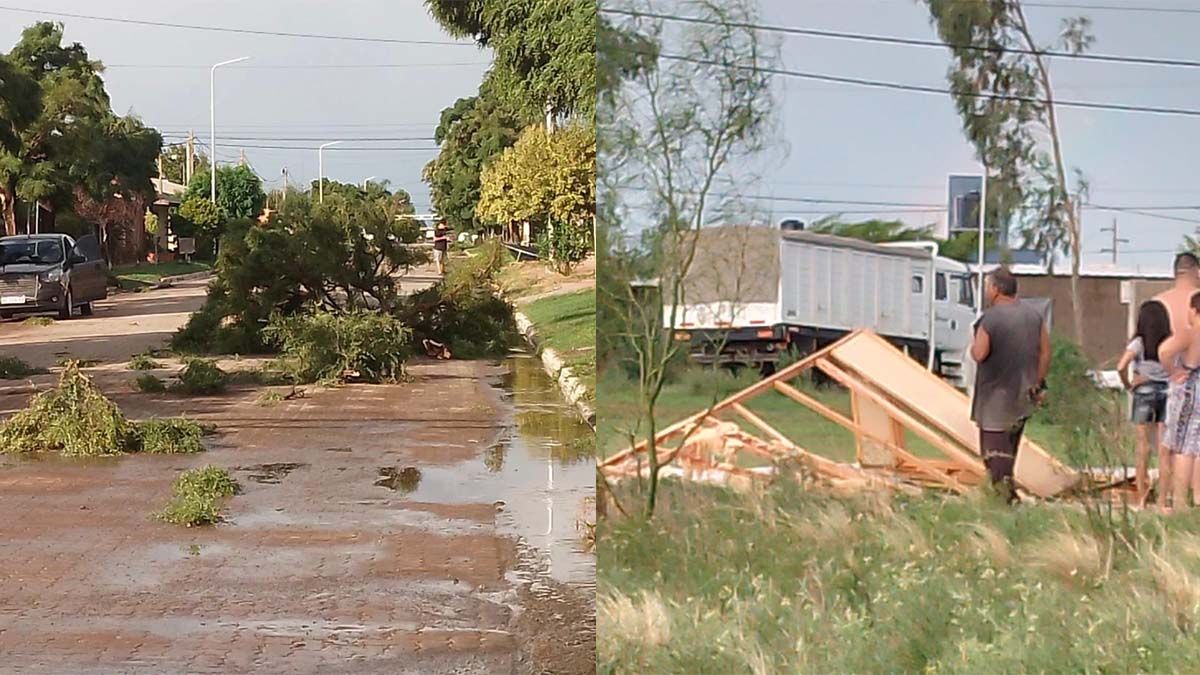 El viento causó voladuras de techos, destruyó por completo casas prefabricadas y dejó a varias familias sin hogar. En distintos sectores del pueblo se observan chapas esparcidas, ramas y árboles caídos, reflejo de la violencia con la que se desató el fenómeno climático.