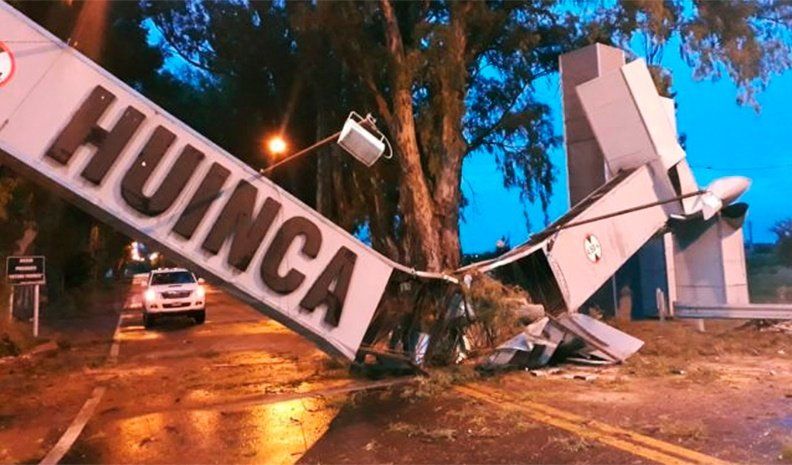 Otra triste postal fue en el ingreso a Huinca por el acceso Frondizi, en la zona este, donde el pórtico de entrada se encontraba destruido a causa de la caída de la rama de un eucaliptus.