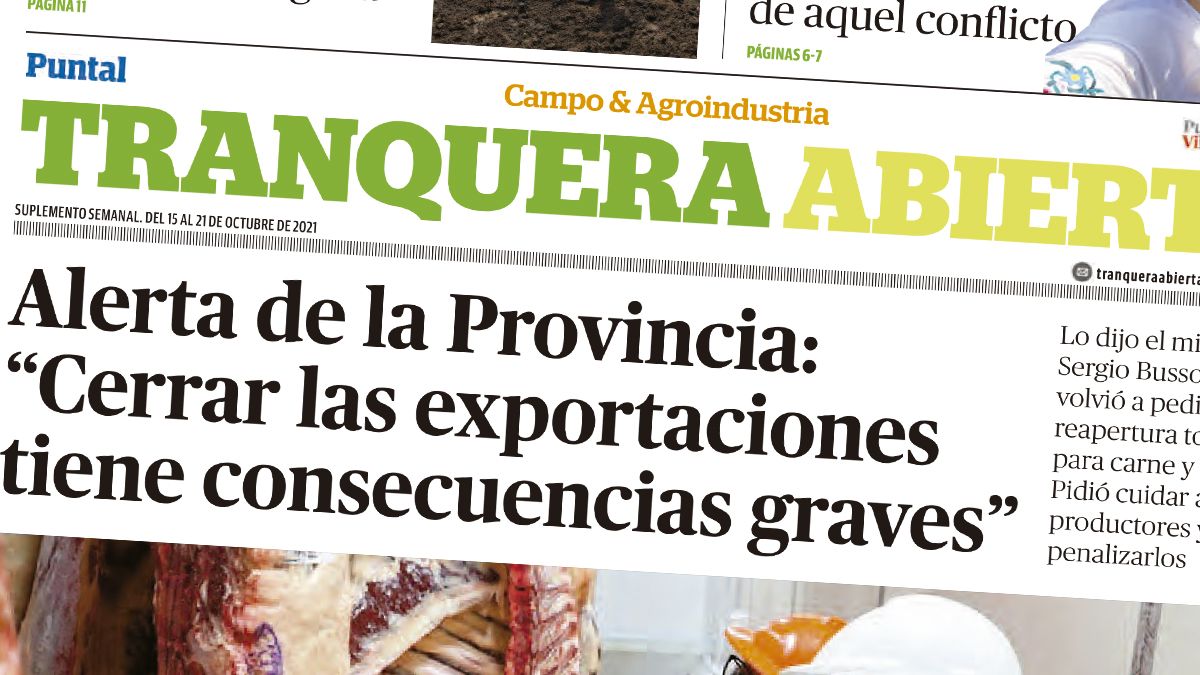 El suplemento Tranquera Abierta trae entre sus títulos principales las consecuencias graves de cerrar exportaciones y el alerta de la Provincia, según dichos del ministro Sergio Busso.
