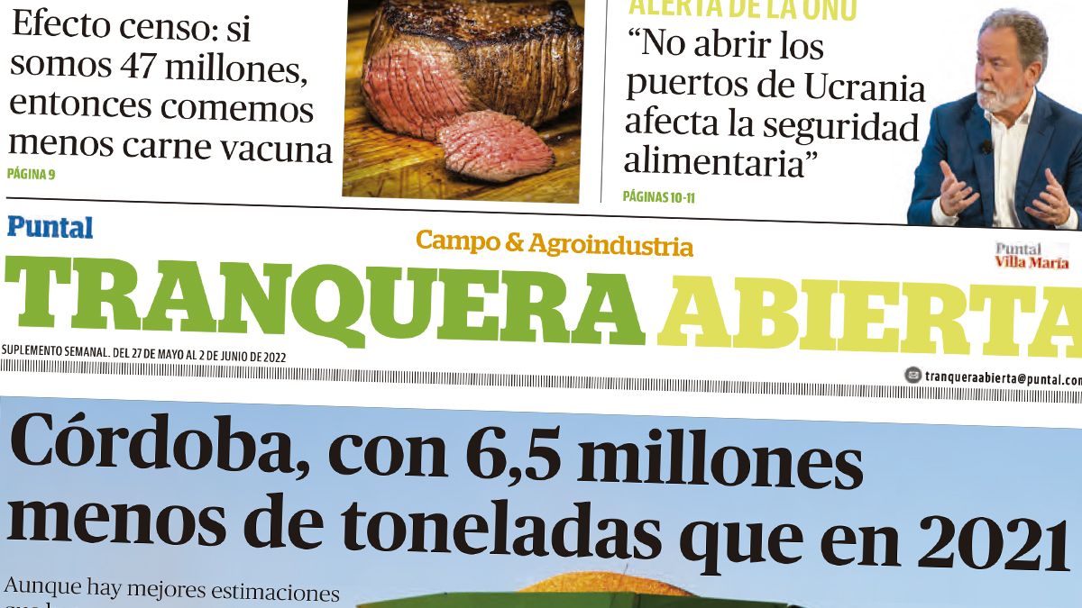 El suplemento Tranquera Abierta de hoy presenta como título más relevante lo que tiene que ver con los volúmenes de cosecha. "Córdoba, con 6,5 millones menos de toneladas que en 2021" hacer referencia a que el clima pegó fuerte en la campaña gruesa. Sólo en maíz hay recortes de 3,7 millones, mientras que la soja resta otros 2,3 millones.