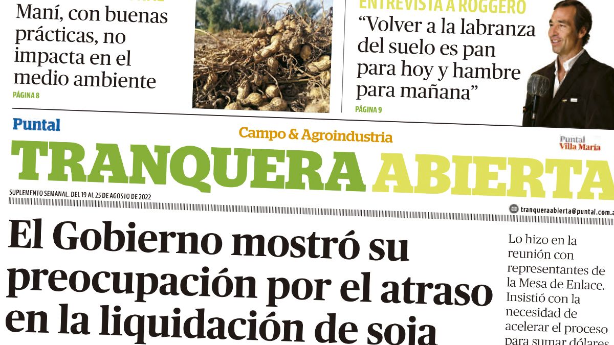 El suplemento Tranquera Abierta de hoy tiene como título principal la preocupación del Gobierno por el atraso en la liquidación de soja, en la reunión con la Mesa de Enlace, desde la Nación se insistió con acelerar el proceso para sumar dólares.