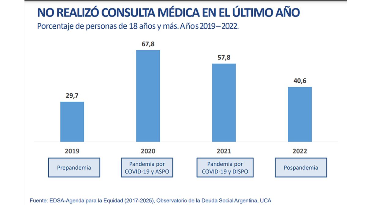 En el año 2019, previo al surgimiento de la pandemia por COVID-19, tres de cada diez adultos de la Argentina urbana informaron (en ese momento) que no realizaban consultas anuales con un profesional médico. Este valor se dispara en el año 2020 con el inicio de la pandemia frente a el advenimiento de las medidas propias del aislamiento social preventivo y obligatorio (ASPO), y de un sistema de salud dedicado casi de manera exclusiva a la contención de la crisis pandémica. En ese contexto, siete de cada diez personas no lograron concretar la atención en salud, lo cual puede entenderse por dar prioridad al sistema de salud ante la enfermedad COVID-19 o a la cancelación de turnos por parte del prestador o el propio paciente por miedo a la exposición al virus. En el año 2021, con el inicio de la campaña de vacunación y la flexibilización de las medidas de prevención, el porcentaje de déficit en la atención médica disminuyó levemente al 57,8% y en contexto de pospandemia, en el año 2022, decrece nuevamente alcanzando al 40,6%. Si bien el indicador demuestra una tendencia a la baja, no se han restablecido los valores observados previos a la crisis sanitaria.