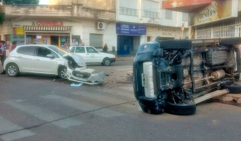 Un violento choque entre una camioneta y un automóvil en el macrocentro de Río Cuarto arrojó como saldo importantes daños en los vehículos involucrados como así también en la infraestructura de la vereda, donde la primera unidad terminó volcada.
