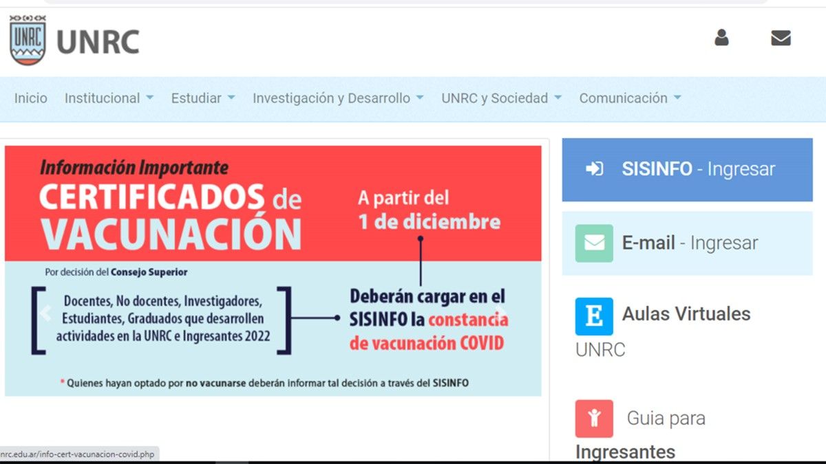 Desde este mes, la Universidad Nacional de Río Cuarto exige que todos quienes desarrollen actividades dentro del campus carguen en el sistema informático la constancia de que se han vacunado contra el Covid-19.
