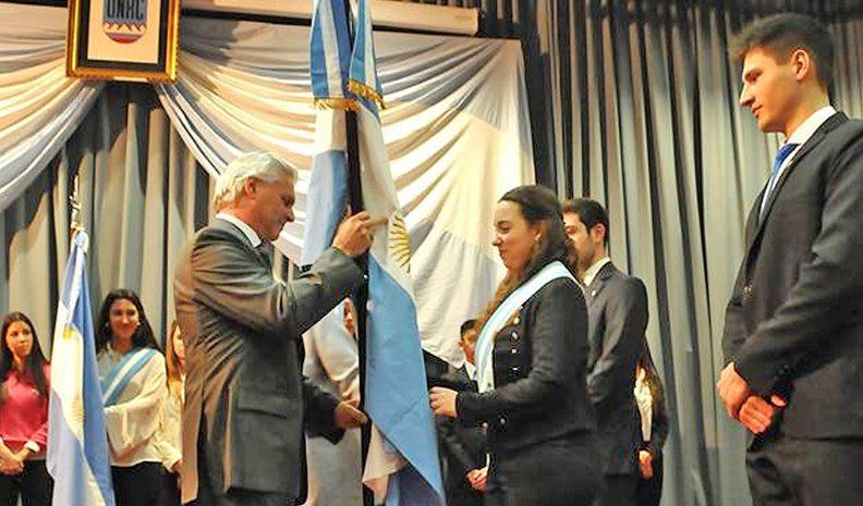 Clara Campero, estudiante de la licenciatura en Historia de la Facultad de Ciencias Humanas, es la flamante abanderada de la enseña mayor, y la escoltan Martín Pérez, de Licenciatura en Biología de la Facultad de Ciencias Exactas, y Matías Barberis, quien cursa la Licenciatura en Economía en la Facultad de Ciencias Económicas.