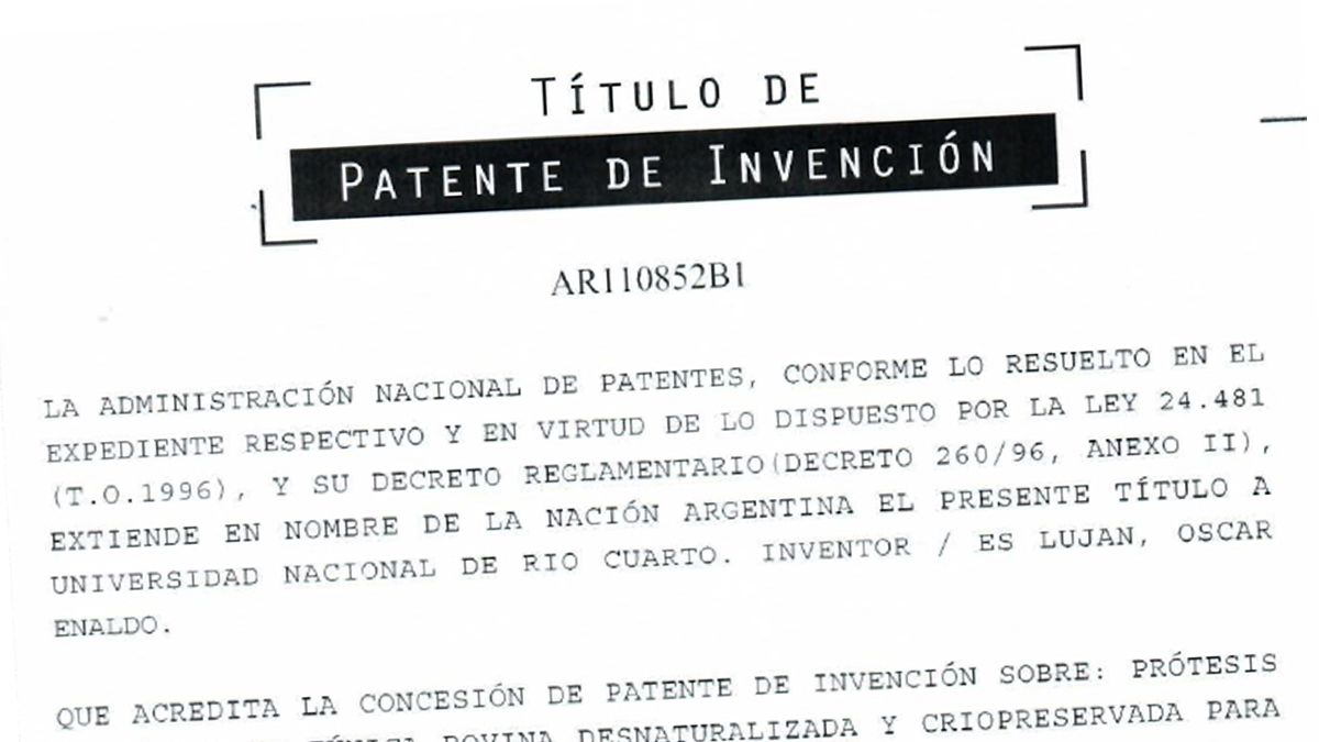 El título de patente de invención que acaba de ser otorgado, textualmente dice: “La administración nacional de patentes, conforme lo resuelto en el expediente respectivo y en virtud de lo dispuesto por la ley 24.481y su decreto reglamentario (decreto 260/96, anexo II) extiende en nombre de la Nación Argentina el presente título a la Universidad Nacional de Río Cuarto. Inventor es Lujan, Oscar Enaldo”. Y agrega que “acredita la concesión de patente de invención sobre: Prótesis biológica de túnica bovina desnaturalizada y criopreservada para trasplantes homólogos y heterólogos”, documentación cuya copia fiel quedó depositada en el Instituto Nacional de la Propiedad Industrial.