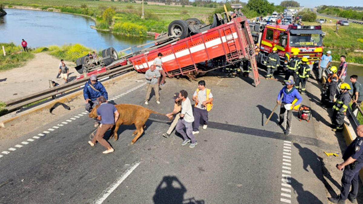El accidente se produjo en el kilómetro 148 de la mencionada ruta, cuando el conductor Rodrigo Orse, de 22 años, perdió el control del camión que manejaba y volcó llevándose puesta la contención del puente sobre el río Arrecifes. De esta manera, el rodado quedó colgando al vacío, por encima del río, mientras que una de las jaulas cayó al vacío. Algunos animales murieron en ese impacto. Sin embargo, otros quedaron vivos.