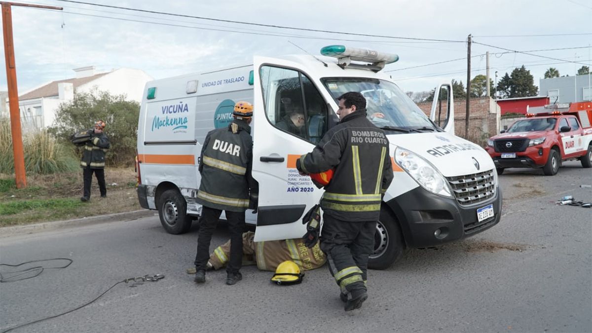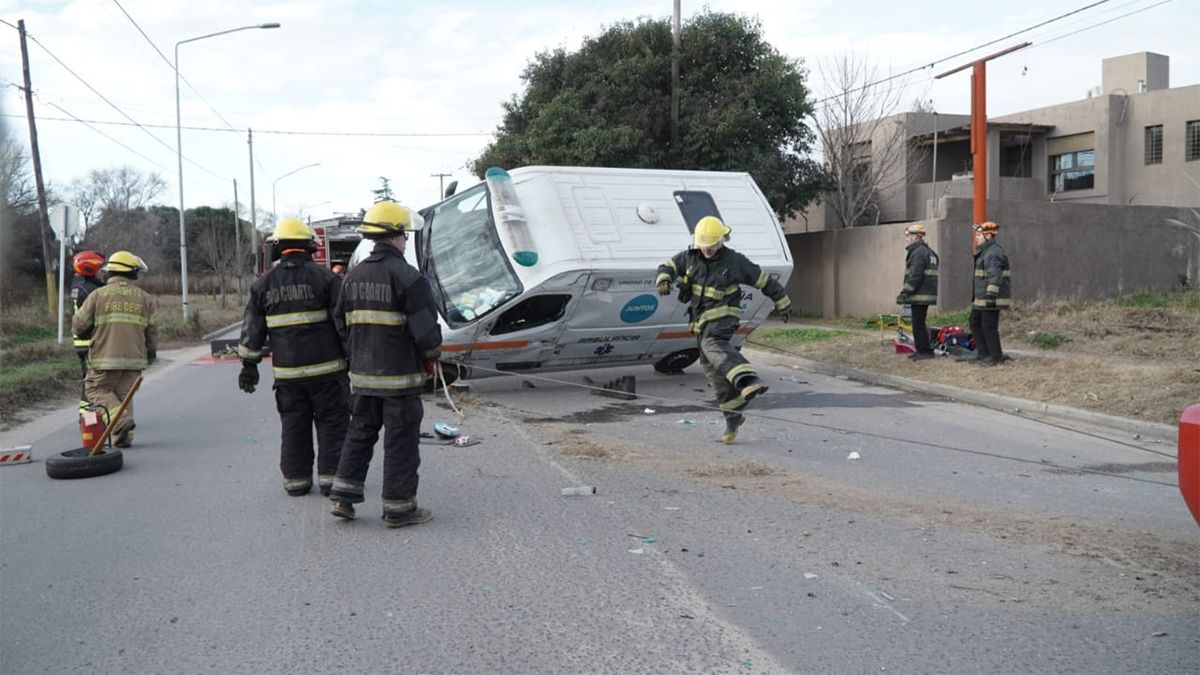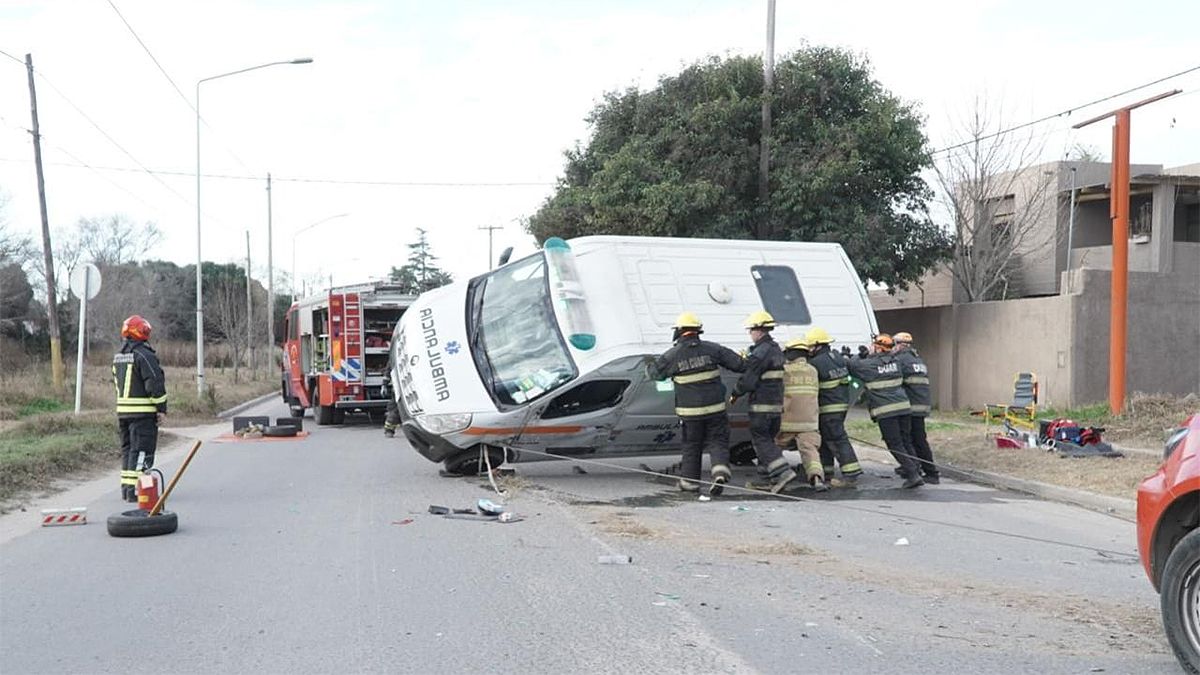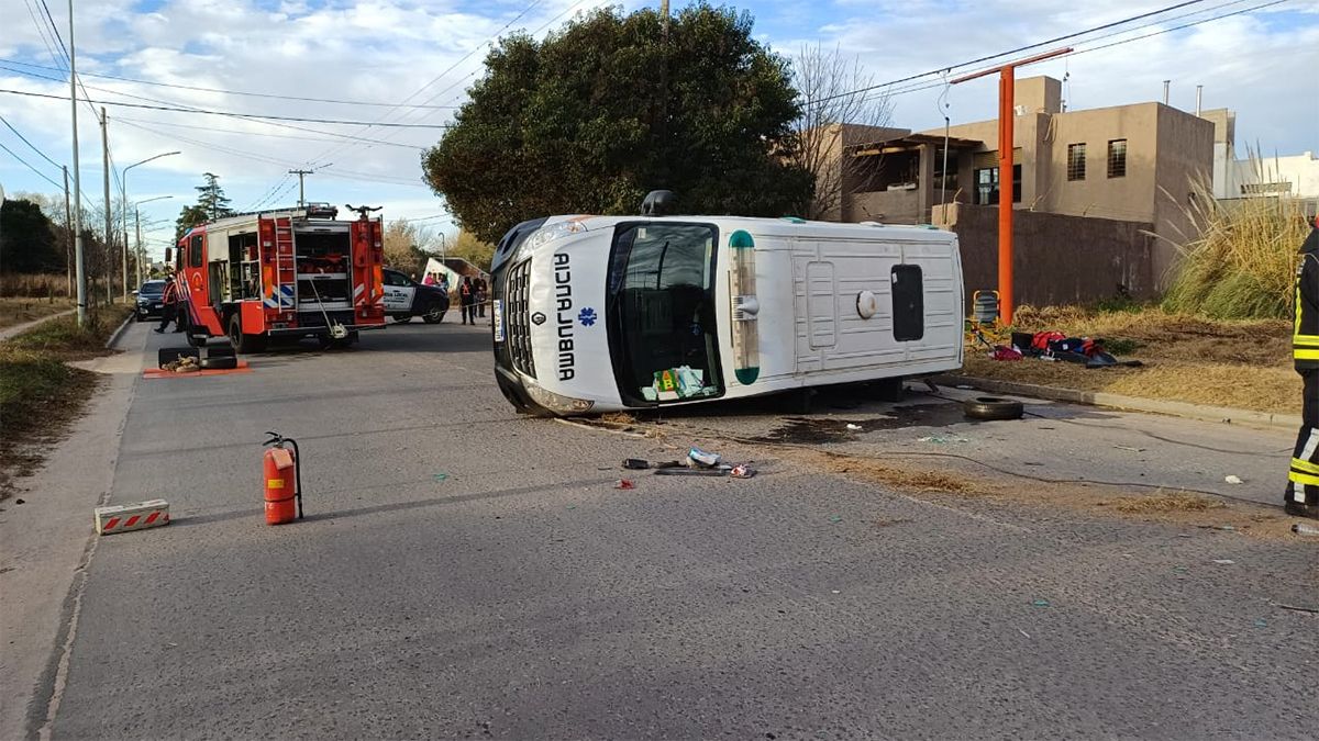 Una ambulancia de Mackenna chocó contra una camioneta y volcó en calle Cervantes