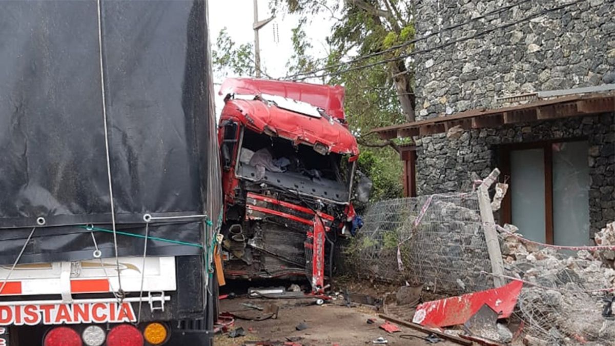 La cabina del camión hizo un efecto “tijera” y volteó parte del cerco perimetral del barrio, dañando el frente de una casa en la que funciona un estudio de arquitectura, se explicó.