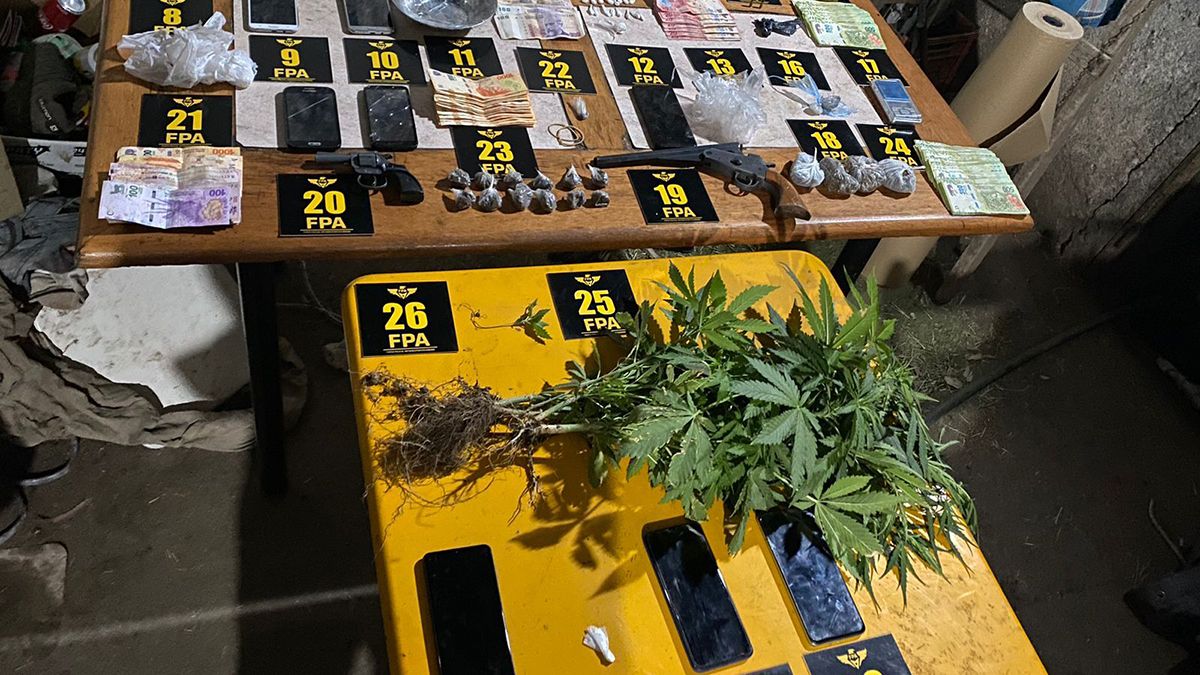 En el punto de venta cerrado, con destacada labor de los canes detectores de narcóticos, se logró la incautación de 250 dosis de marihuana y 63 de cocaína, siete plantas de cannabis sativa, dinero ($147.780), una balanza digital, dos armas de fuego (un calibre 22 y un pistolón) y elementos relacionados a la causa.