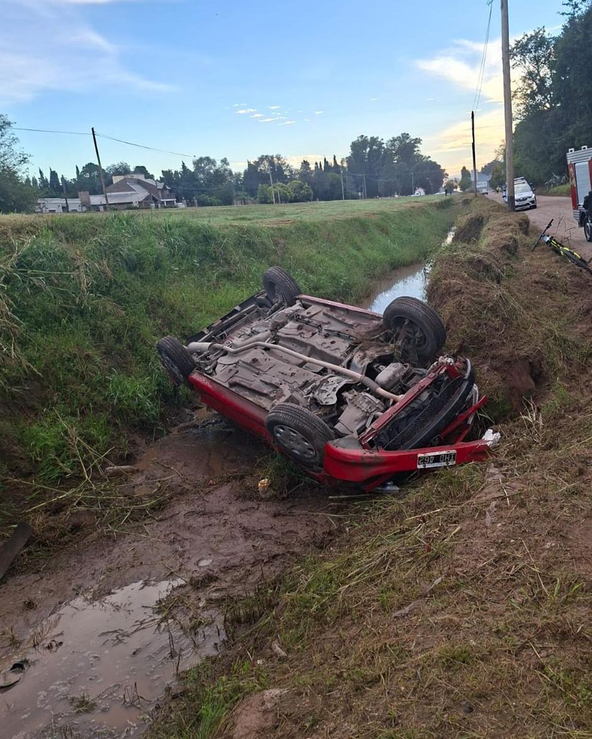 El siniestro se registró en calle Juan XXIII al 900, cuando el conductor de un Peugeot 206 rojo perdió el control del vehículo, impactó contra los bordes de tierra y terminó volcando dentro de un canal de desagüe.